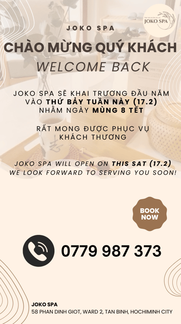 Joko Spa58 Phan Dinh Giot, Ward 2, Tan Binh District, Hochiminh City, Vietnamjokospa.vn | hello@jokospa.vn